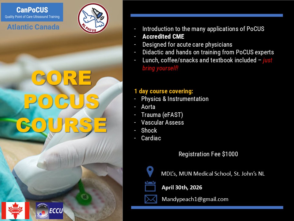 Looking to maintain your knowledge and learn some advanced applications? Join us for our online NL PoCUS Grand Rounds with national experts from across the country sharing PoCUS wisdom. Next upcoming rounds will be March 2026 with local rheumatologist Dr. Maria Powell on MSK applications. More details to come.
